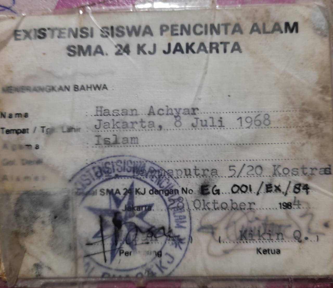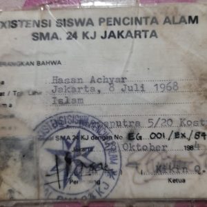 Hasan Achyar, atau yang akrab disapa entol, membawa serta KTA Exispal 24KJ bernomor EG/001/EX/84 kemanapun dia pergi. KTA itu bahkan sudah keliling dunia saat dirinya menjadi anak buah kapal. Jelajah hidupnya adalah spirit yang tertanam di KTA Exispal 24KJ. Entah sudah berapa gunung dia daki. Semua telah menjadi cerita manis yang kelak bisa dia kisahkan ke anak cucu.